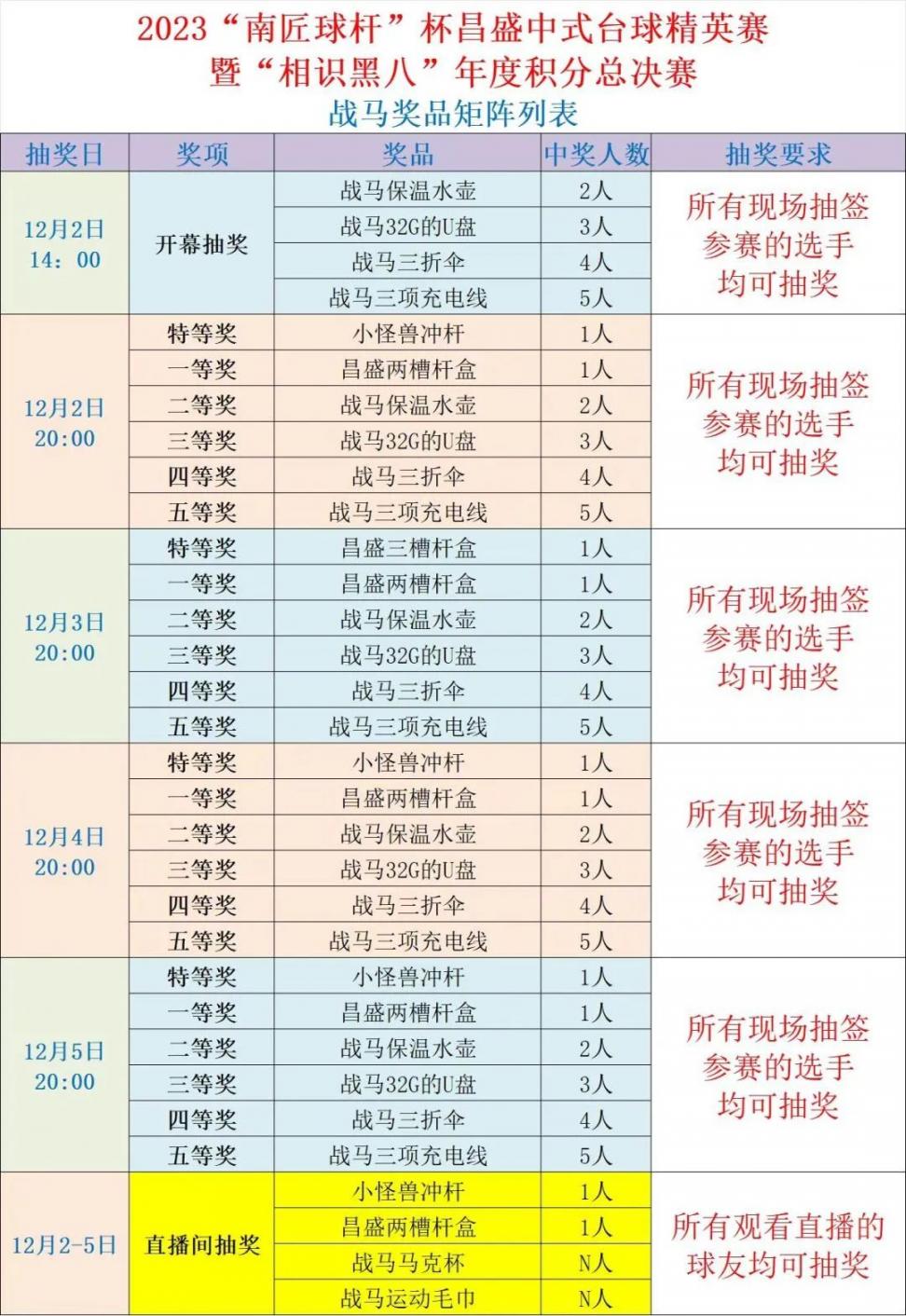 “相识黑八”赛事团队还精心策划了多轮抽奖环节,每位参赛选手都有一个幸运球,每日均会揭晓一轮大奖。每日的奖品为特等奖小怪兽冲杆,一等奖昌盛两槽杆盒,二等奖战马保温水壶,三等奖战马32U盘,四等奖战马三折伞,五等奖战马三项充电线。