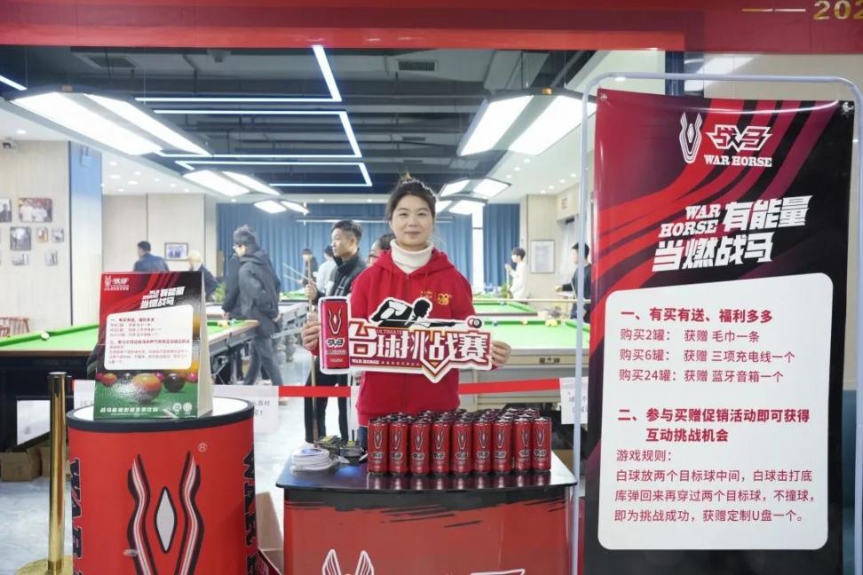 昌盛台球还特别设置了“梁国挑战赛”互动环节,所有到店的朋友都可以报名挑战梁国。挑战成功者可以获得皮头、枪粉、杆盒等奖品。赞助商之一的战马也在比赛现场设计了台球趣味游戏,为参赛选手准备了众多奖品和战马能量型维生素饮料。